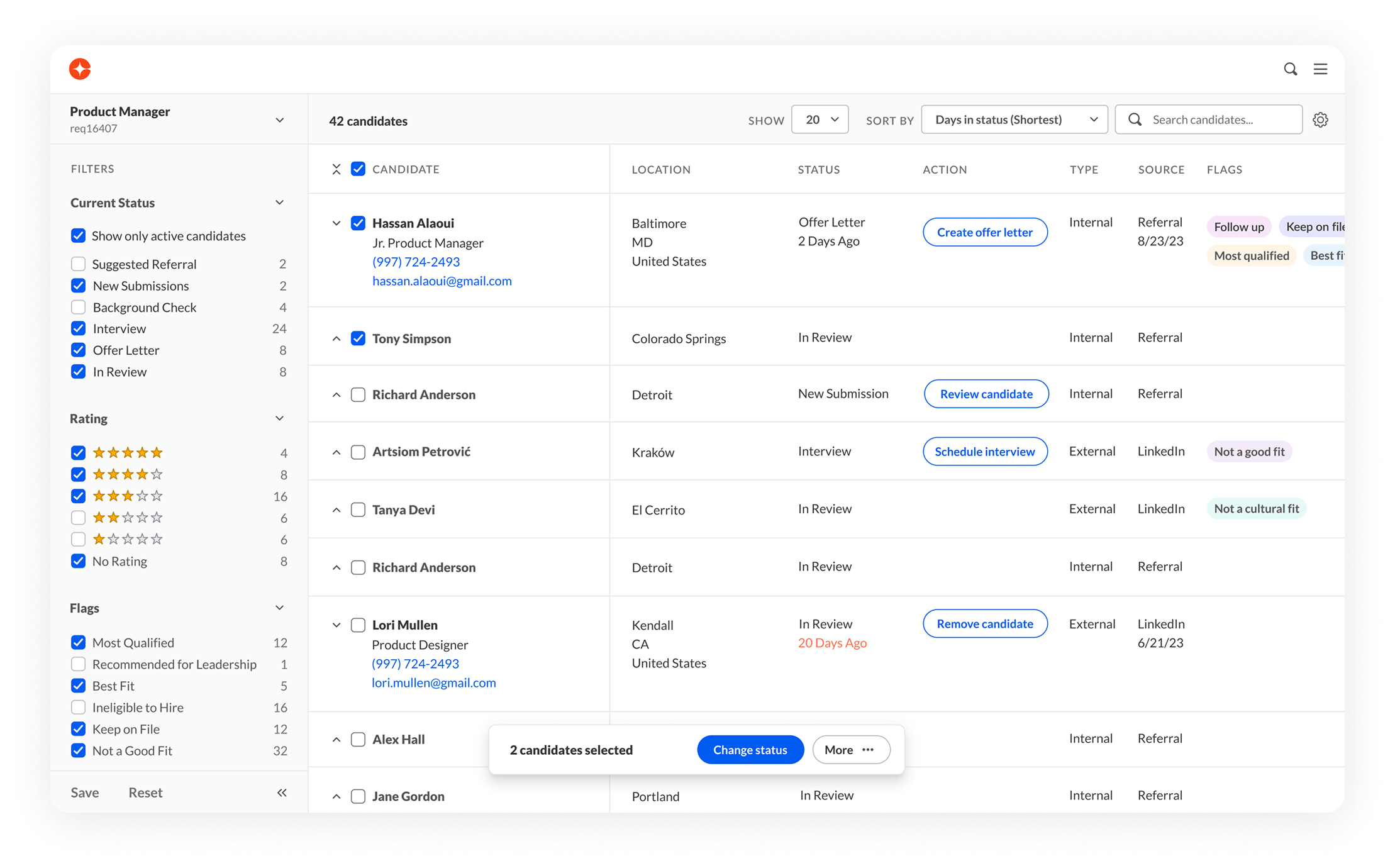 Recruiters complete most tasks on the ‘View Profile’ page after bulk selecting candidates in the table.